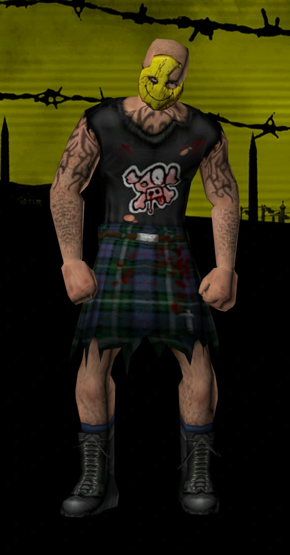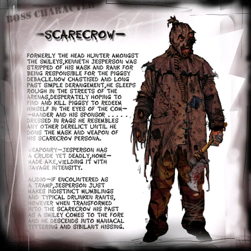 During the development stage, the Smileys used to have a leader before the idea was scrapped. His name was Kenneth Jesperson, the former head hunter of the Smileys who was stripped of his mask and rank by his own gang for being responsible for an incident known only as “The Piggsy Debacle” that could be related to the barring of his Smileys gang from the hunt for their gross disobedience. This backstory, along with almost everyone and everything tied to it, was scrapped from the final product.[8]