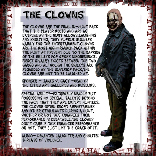 Like the rest of the gangs in his snuff film, Starkweather bailed the Smileys out so that they can take over the asylum as hunting grounds where Cash can murder them for the Director.[1][2][10] The release of the Smileys may also be connected to the closing of their prison, possibly done to shut both the Smileys and Cash inside while keeping the snuff film shooting secret. Just like what he did to the other gangs, the Director compromised the positions and plans of the Smileys for Cash to exploit.[4][5] They are the only group of hunters who actually impress Starkweather,[11] but they are still below him as he sentences them all to die by his script.[12][13][14][15][16][17][18][19][20]