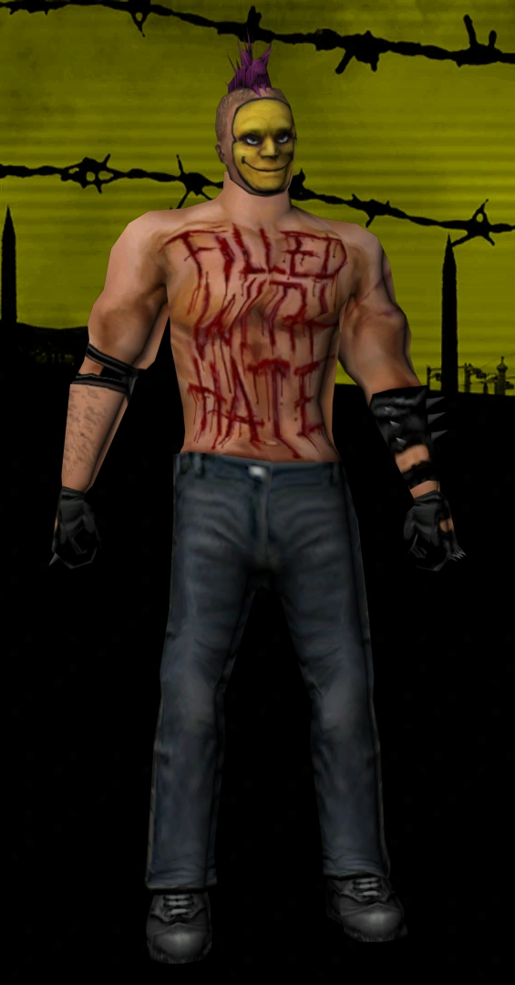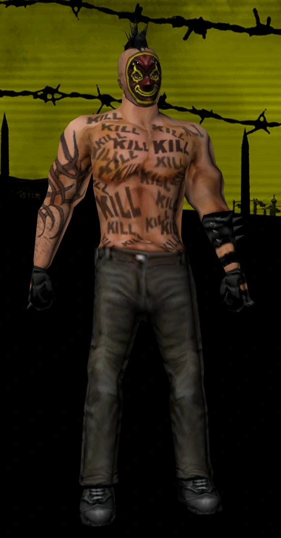 Cut from the same cloth as James Earl Cash, the Smileys are the insane inmates of Darkwoods Penitentiary set loose by the machinations of Lionel Starkweather that he may use them for his latest snuff videos.[1][2] Named after their off-putting smiley masks and facial paintings, the Smileys torture and murder their victims out of their irrational and inscrutable reasons and desires, making them all the more dangerous and nigh-unpredictable.